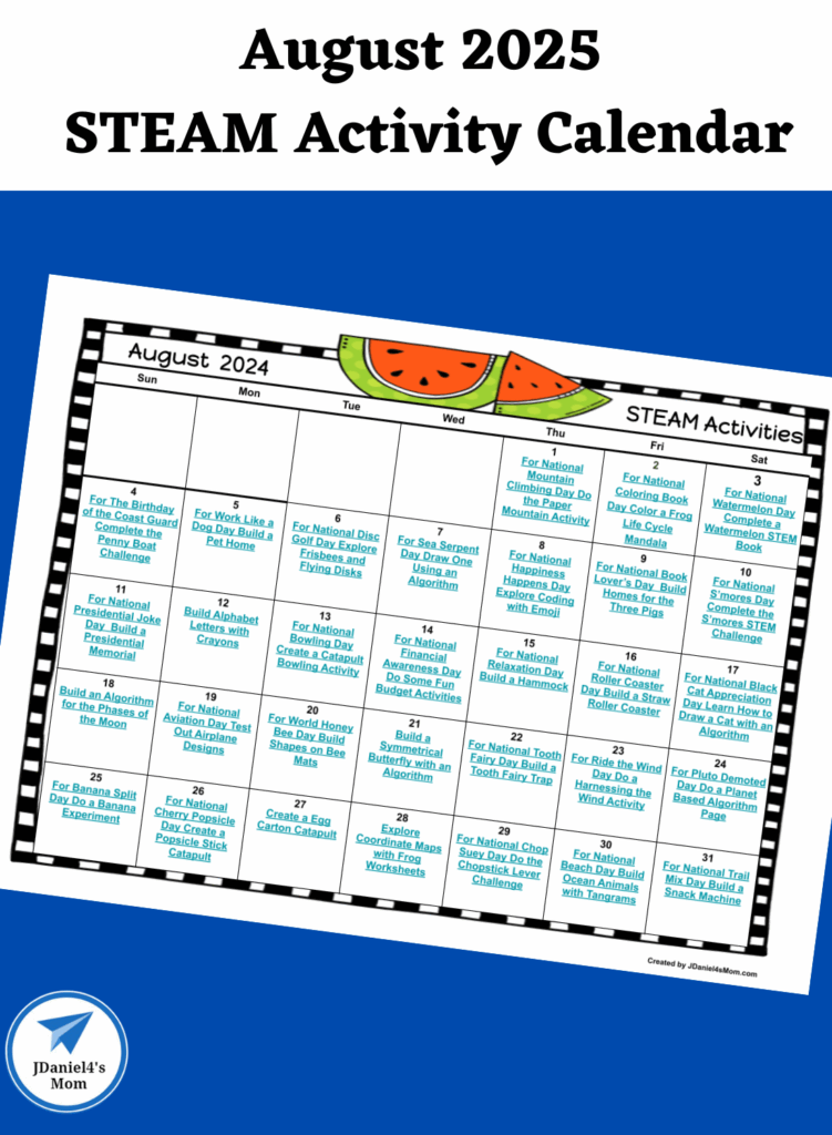 Summer break may be getting ready to come to an end or be beginning its second month. Either way your children will enjoy exploring this August 2025 STEAM activities calendar. It is filled with activities based on August holidays and themes that your children will have fun doing.